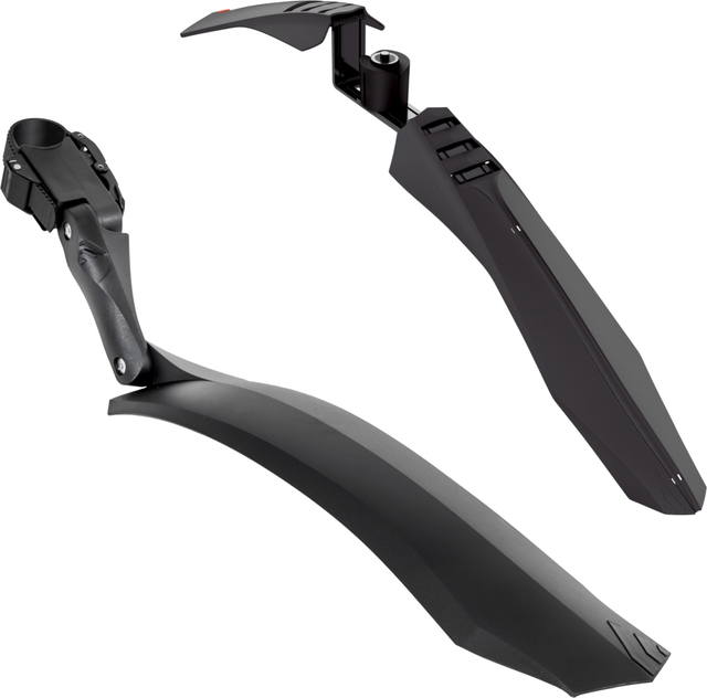 Das Anbringen des VIPER X Set ist nahezu universell. Das vordere Blech wird im Gabelschaft befestigt und findet bei unterschiedlichsten Schaftdurchmessern Anwendung. Das hintere Blech wird direkt an der Sattelstütze befestigt. Die Befestigung stammt gewöhnlich aus dem Skibereich und bietet besten Halt. Das Mountainbikeblech wurde für 26“-Räder konzipiert, passt aber für jede Radgröße von 26"-29".