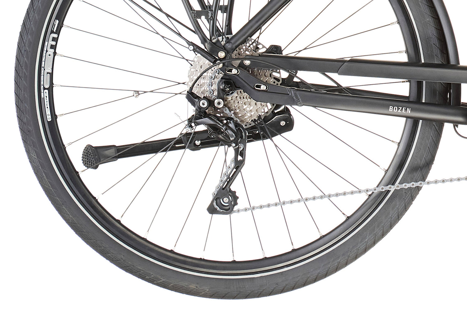 Das Bozen bietet dir durch die Federgabel mit einem Federweg von 80 Millimetern ein sehr komfortables Fahrerlebnis und die breiten, leicht profilierten Schwalbe-Reifen mit Pannenschutz ermöglichen dir auch Fahrten auf dem Feldweg.