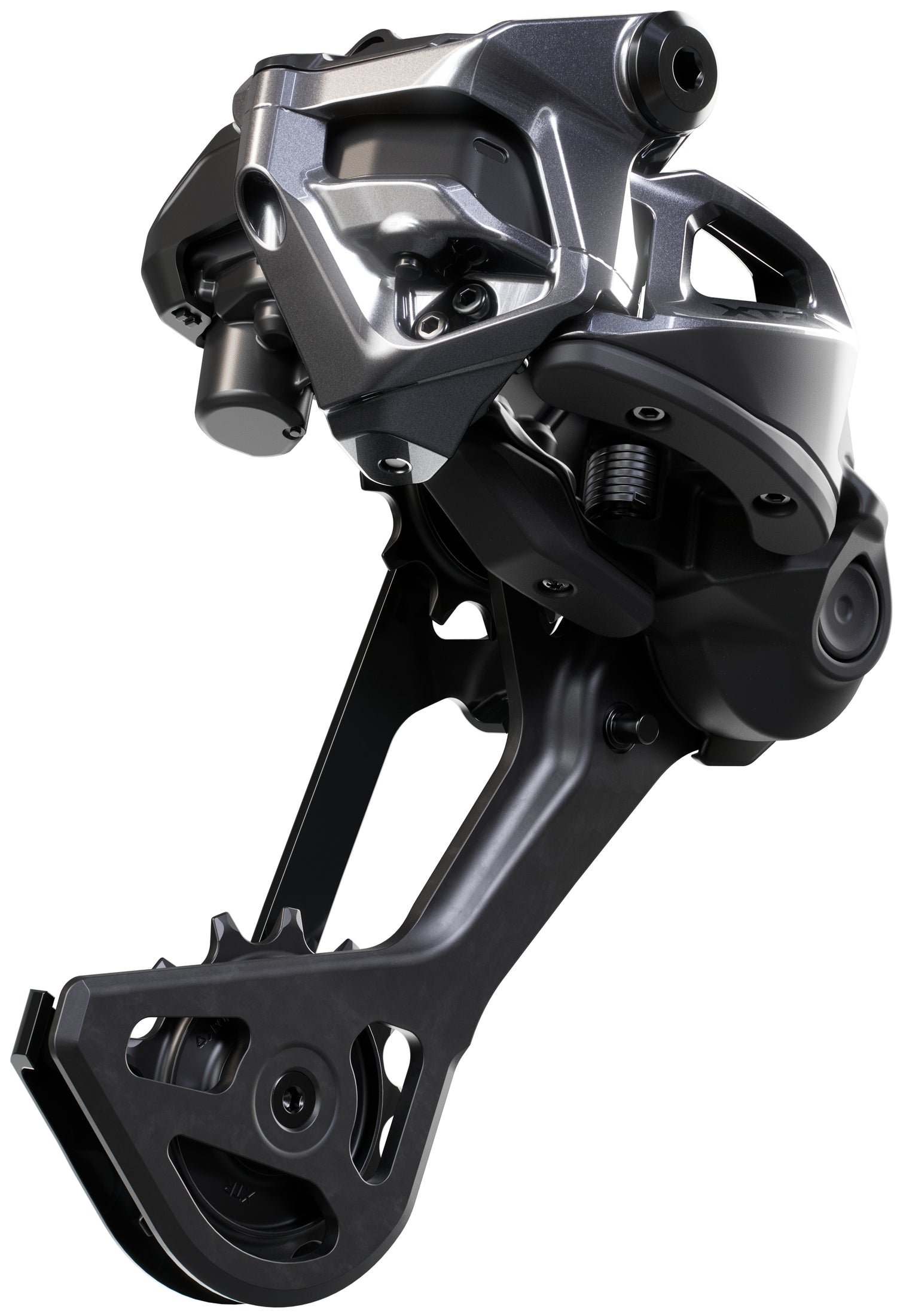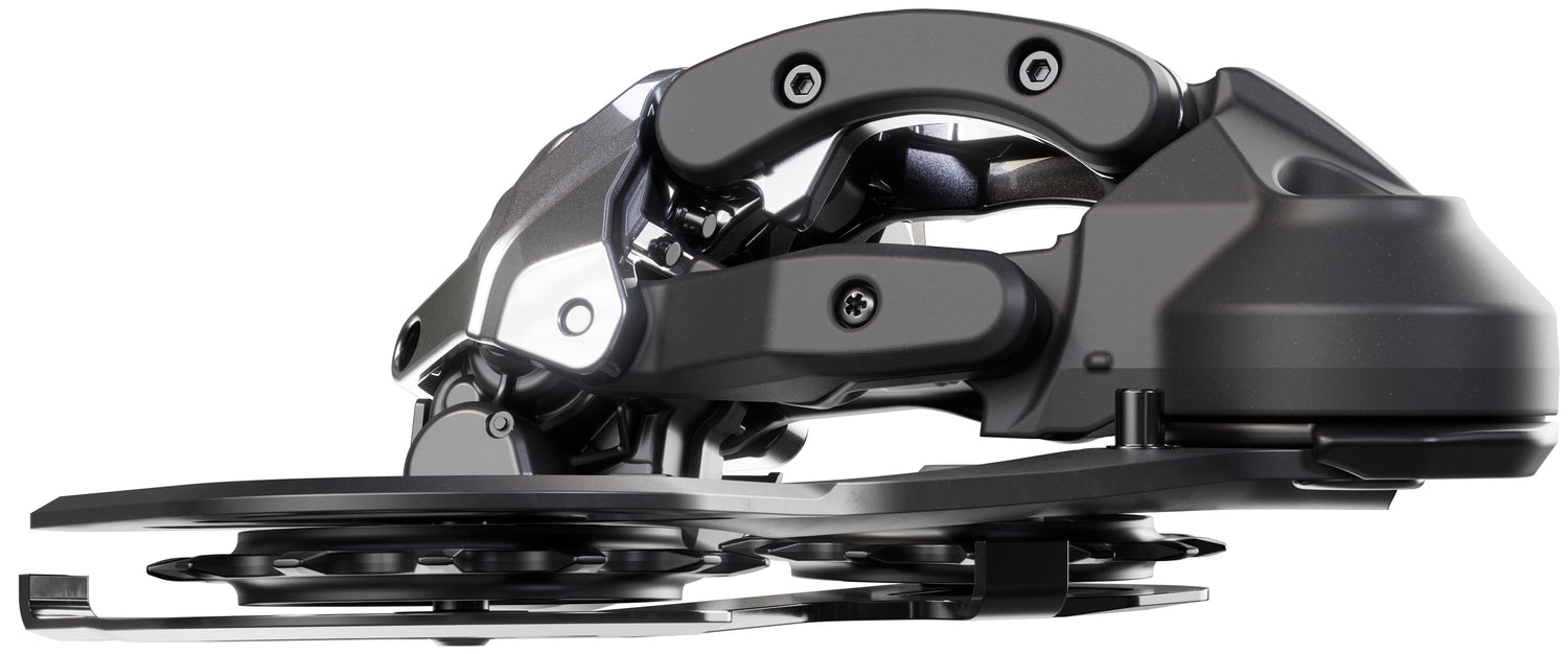 Robuste Konstruktion: Eine breite Gelenkstruktur, das Gleitplattendesign, die haltbare Carbonplatte und massive Schaltrollen verleihen dem Schaltwerk Robustheit und Langlebigkeit, während der neue schmale Stabilisator das System laufruhig macht,
